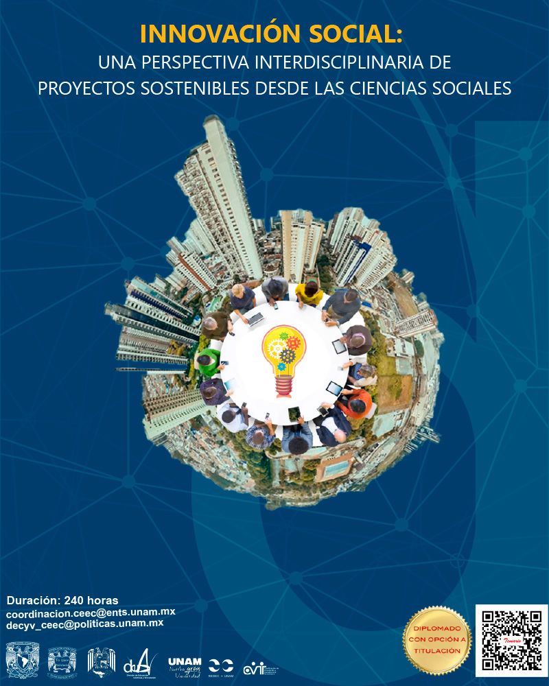 El diplomado Innovación Social: Una perspectiva interdisciplinaria de proyectos sostenibles desde las Ciencias Sociales, se propone como parte de las Nuevas formas de titulación correspondiente a la modalidad de ampliación y profundización de conocimientos. Como una iniciativa temática y novedosa que se propone a la comunidad estudiantil de la UNAM, con la finalidad de incentivar la creatividad y el interés en el desarrollo de proyectos sociales con factibilidad de realización en contextos sociales específicos. En este sentido, y con la finalidad de enriquecer la perspectiva analítica y práctica del evento educativo, la iniciativa impulsada por la División de Educación Continua y Vinculación de la FCPyS, incorpora además la perspectiva del Centro de Educación Continua de la Escuela Nacional de Trabajo Social (ENTS) así como de la Coordinación de Vinculación y Transferencia Tecnológica (CVTT), todas dependencias de la UNAM, que han participado de manera entusiasta, en la planeación y estructuración temática del diplomado.